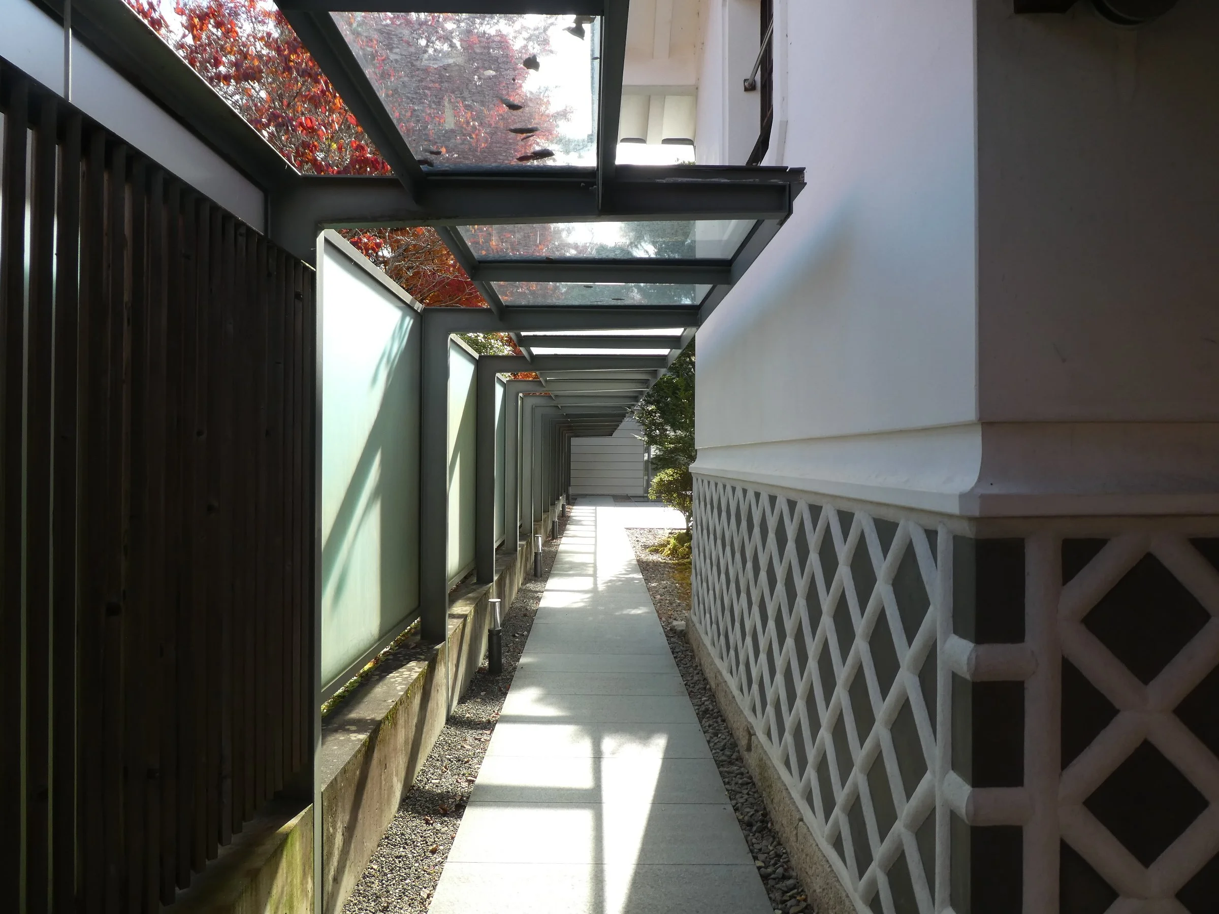 渡り廊下からの切り取られた紅葉も絵になり