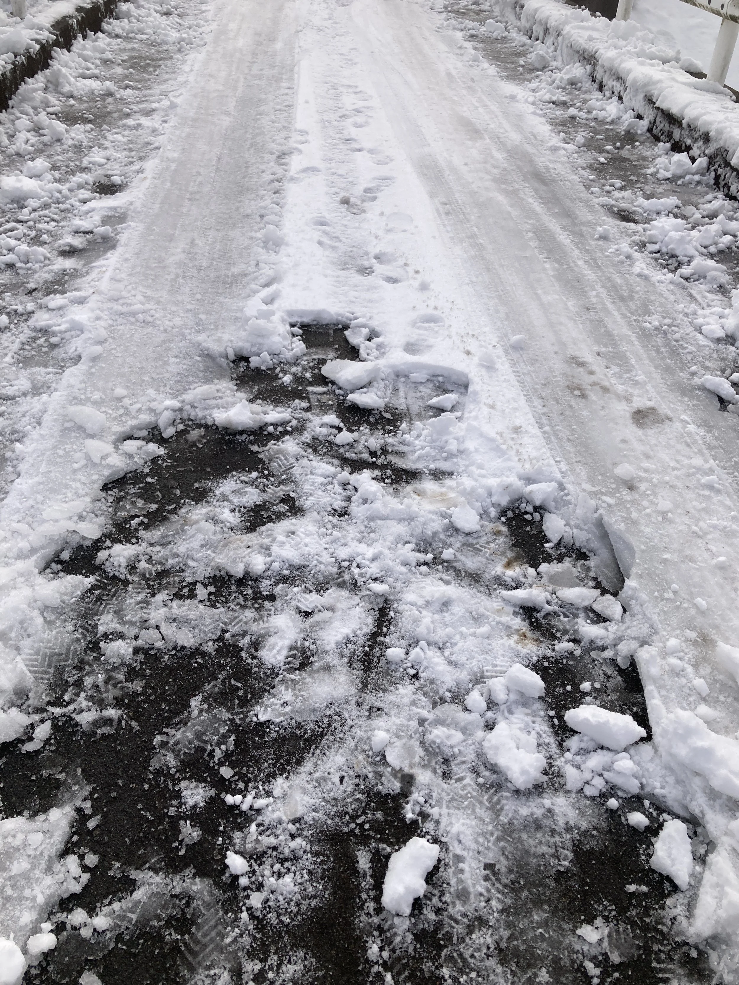 先日降った雪が降り積もった橋の上は、車の行き来によって凍り付き、車で通るたびにガタガタと振動が伝わり、どこか不快を感じる状態でした。