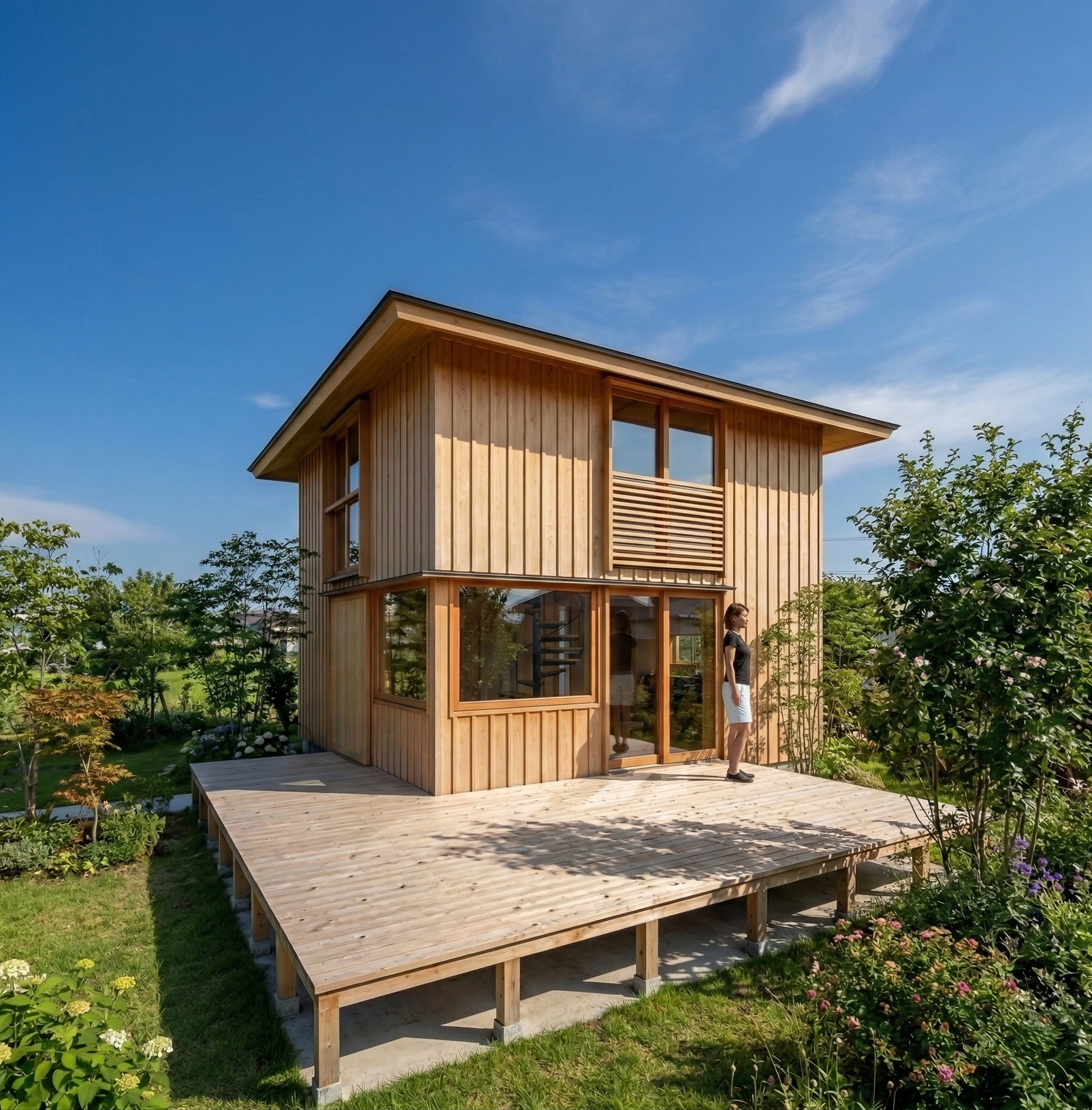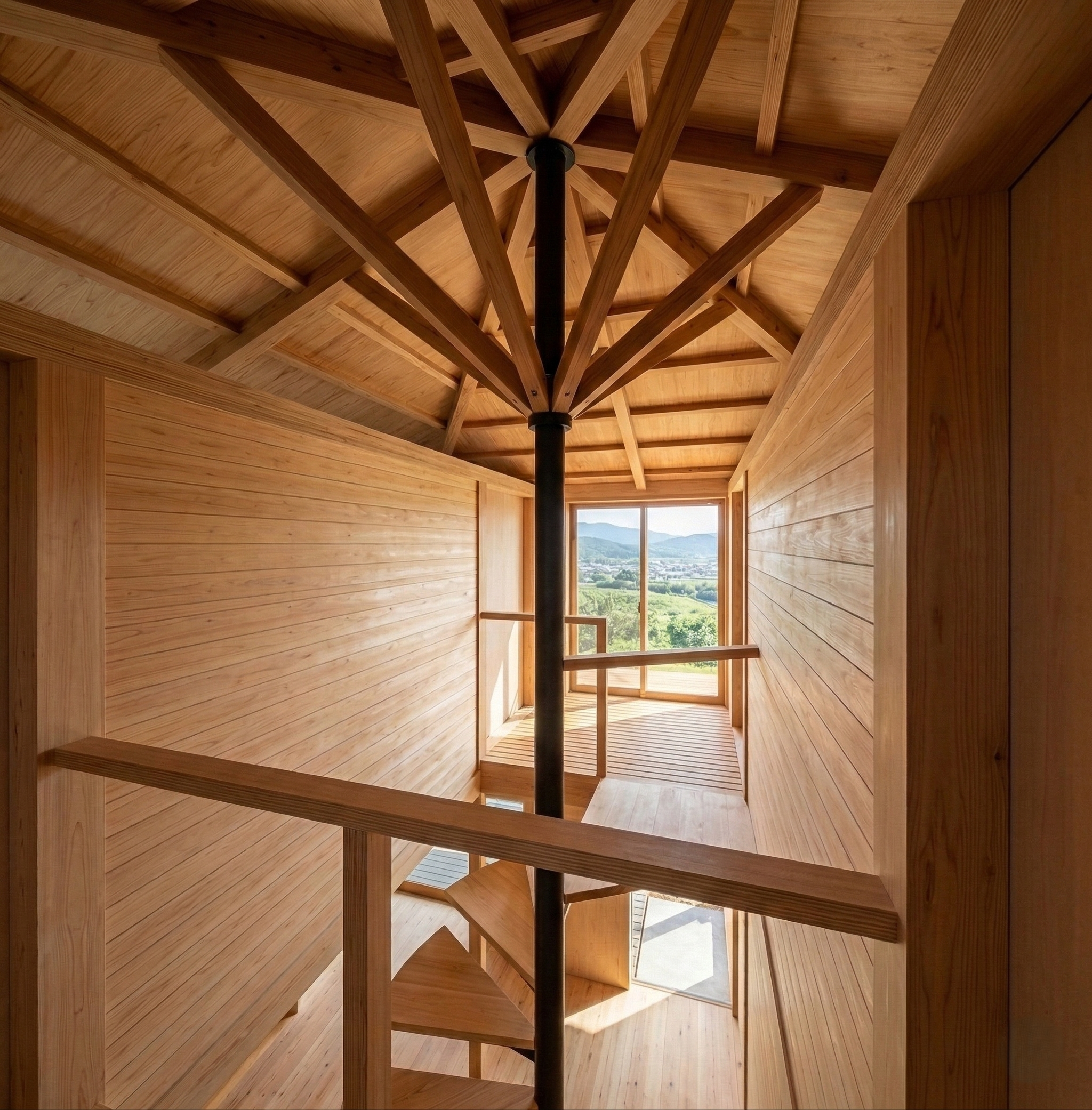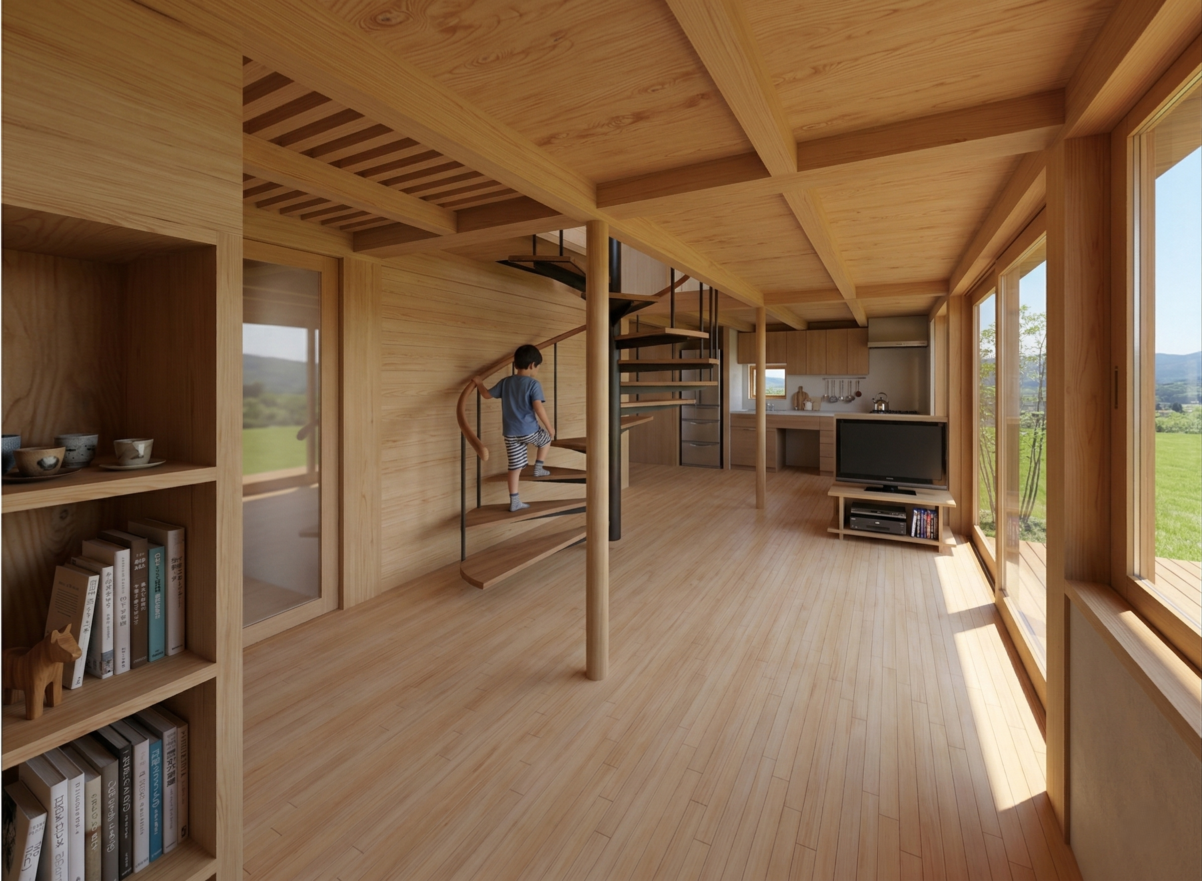 建坪9坪、総二階建てのタイニーハウス。1間ごとに柱が建つ安定した構造の中心部にらせん階段を置き上下の階を結びます。